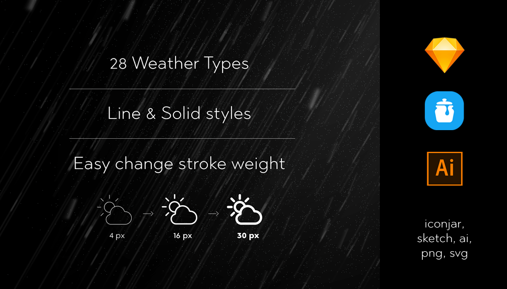 Weather Icons Set$24$24https://schema.org/InStockusdlikeappleslikeapples Well-organized 56 icons. Features: 28 Weather Types Line & Solid styles Easy change stroke weight Add to cartSize4.15 MBAdd to wishlist New wishlistShareShare on XShare on Facebook Copy linkCopy product URL